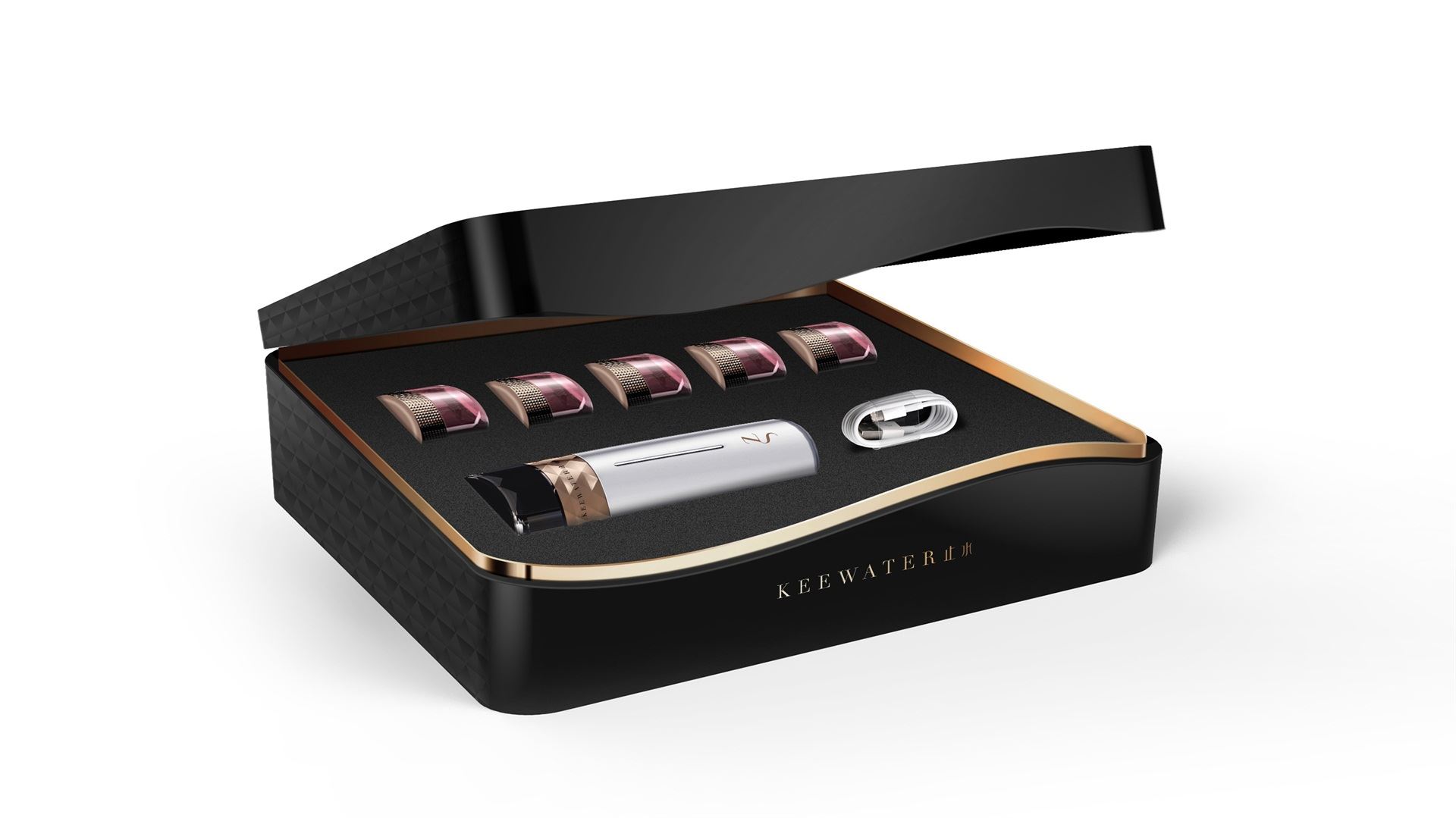 止水(英文名“Keewater” 寓意精華之水)源自法國品牌積姬仙奴,名稱取自成語“心如止水”、“明鏡止水”,代表了企業專注于智能美容行業,致力于解決肌膚補水時間長、效果差難題的精神。